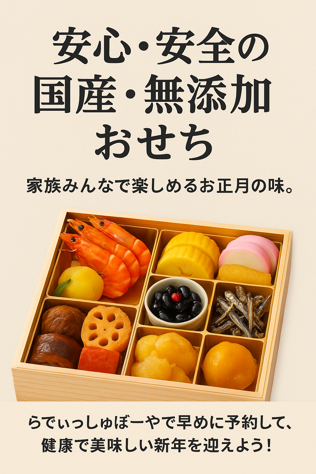 新しい年の始まりを彩る「おせち料理」。せっかくのお正月だからこそ、家族みんなが安心して楽しめるものを選びたいですよね。そんな方におすすめなのが、らでぃっしゅぼーやの国産・無添加おせちです。国産素材を中心に使い、添加物を極力控えたおせちは、健康志向の方や小さなお子様のいるご家庭にも最適です。