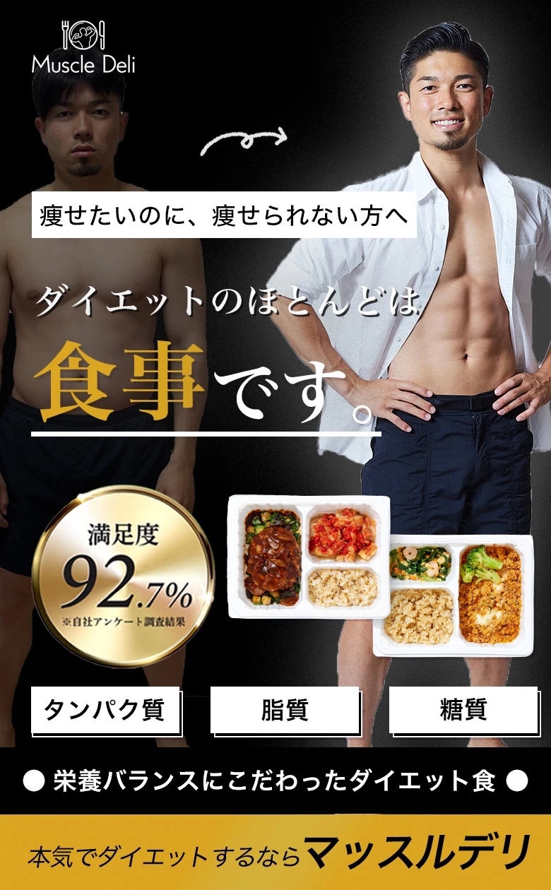 健康的で理想的なカラダを目指す方におすすめなのが、「Muscle Deli(マッスルデリ)」です。日々の食事で不足しがちなたんぱく質や栄養素をバランスよく摂取できる冷凍宅配フードとして、多くの方に支持されています。手軽に取り入れられる食事で、無理なくカラダづくりをサポートすることができます。