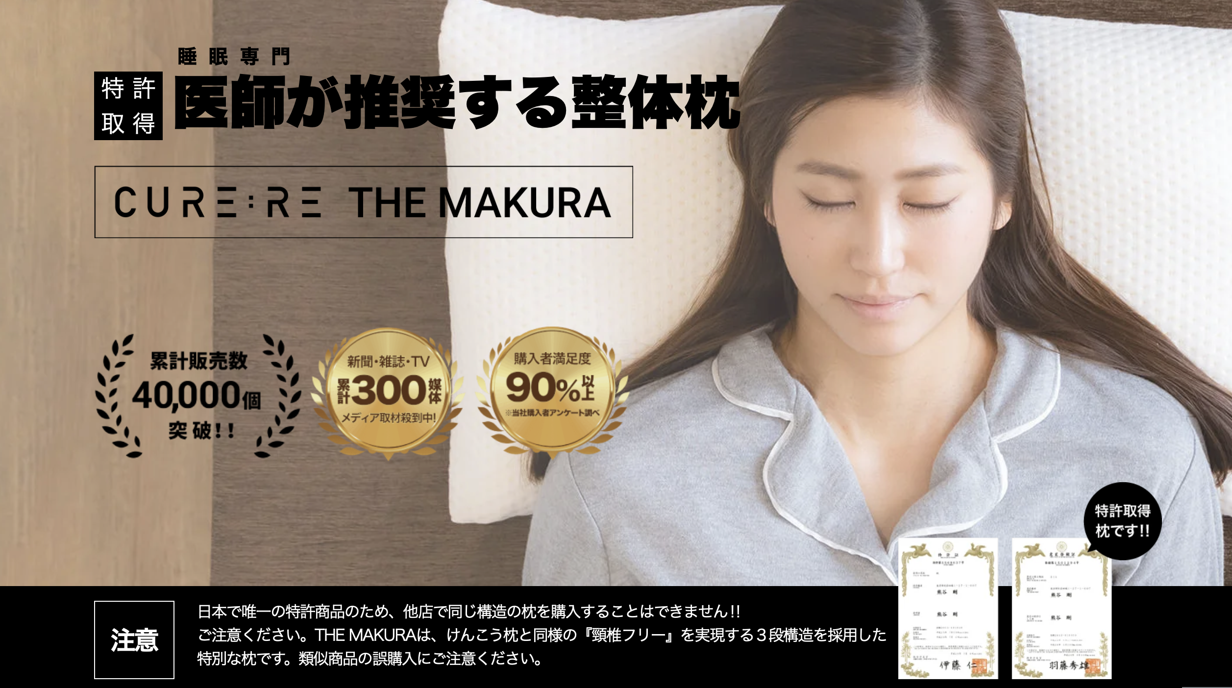 「Cure:Re THE MAKURA」は、整体師が手技で行う“理想的な姿勢”をもとに独自設計された構造を持っています。その構造が特許を取得しており、単なる高反発や低反発の枕とは異なり、寝ている間に頭・首・肩・背中のラインを自然に支えるようデザインされています。