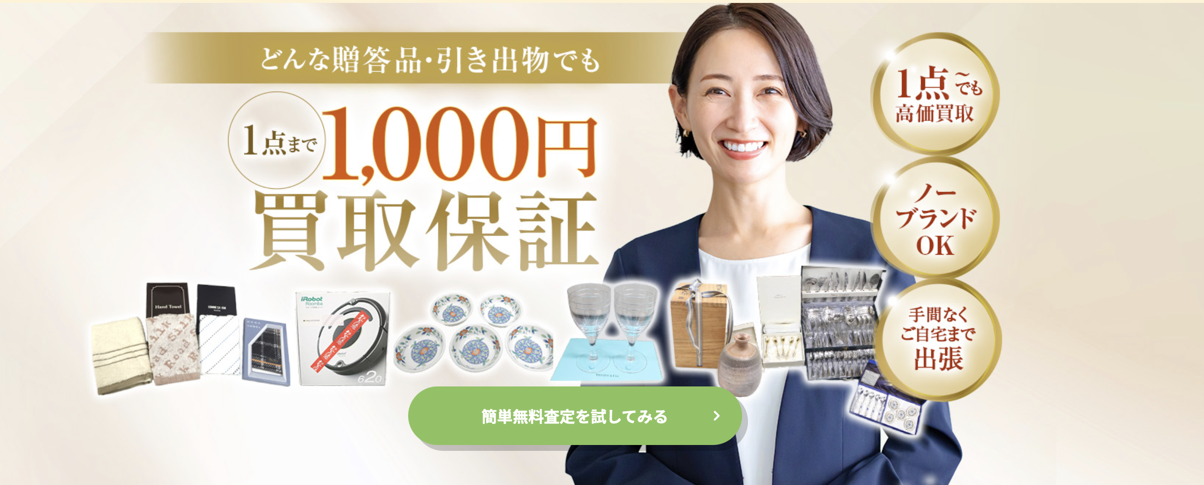 「どんな贈答品でも最低1,000円買取保証」は、贈答品の整理に悩む個人向けに設計された買取サービスです。ブランド品、食器、タオル、ギフトセット、カタログギフト、雑貨など、ジャンルを問わず査定を行い、査定額が1,000円未満の場合でも最低1,000円での買取を保証します。面倒な手続きや複雑な条件を減らし、手軽に不要品を現金化したい方に最適です。
