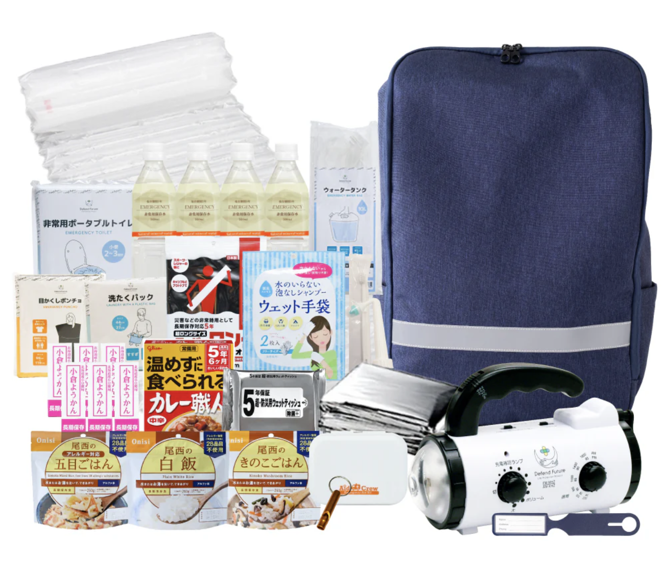 - 充電・照明用品が充実:停電時や夜間の避難でも安心のライト・ランタン・予備電池付き。