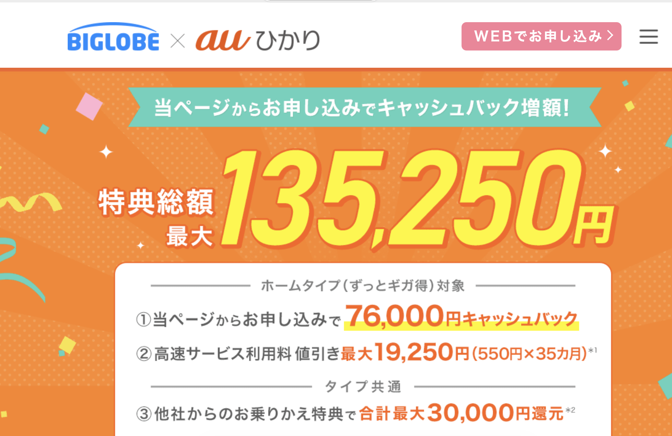 現在、auひかり【BIGLOBE】ではお得なキャンペーンも実施中です。キャッシュバックや工事費無料などの特典を活用して、快適なネット生活をスタートさせましょう。
