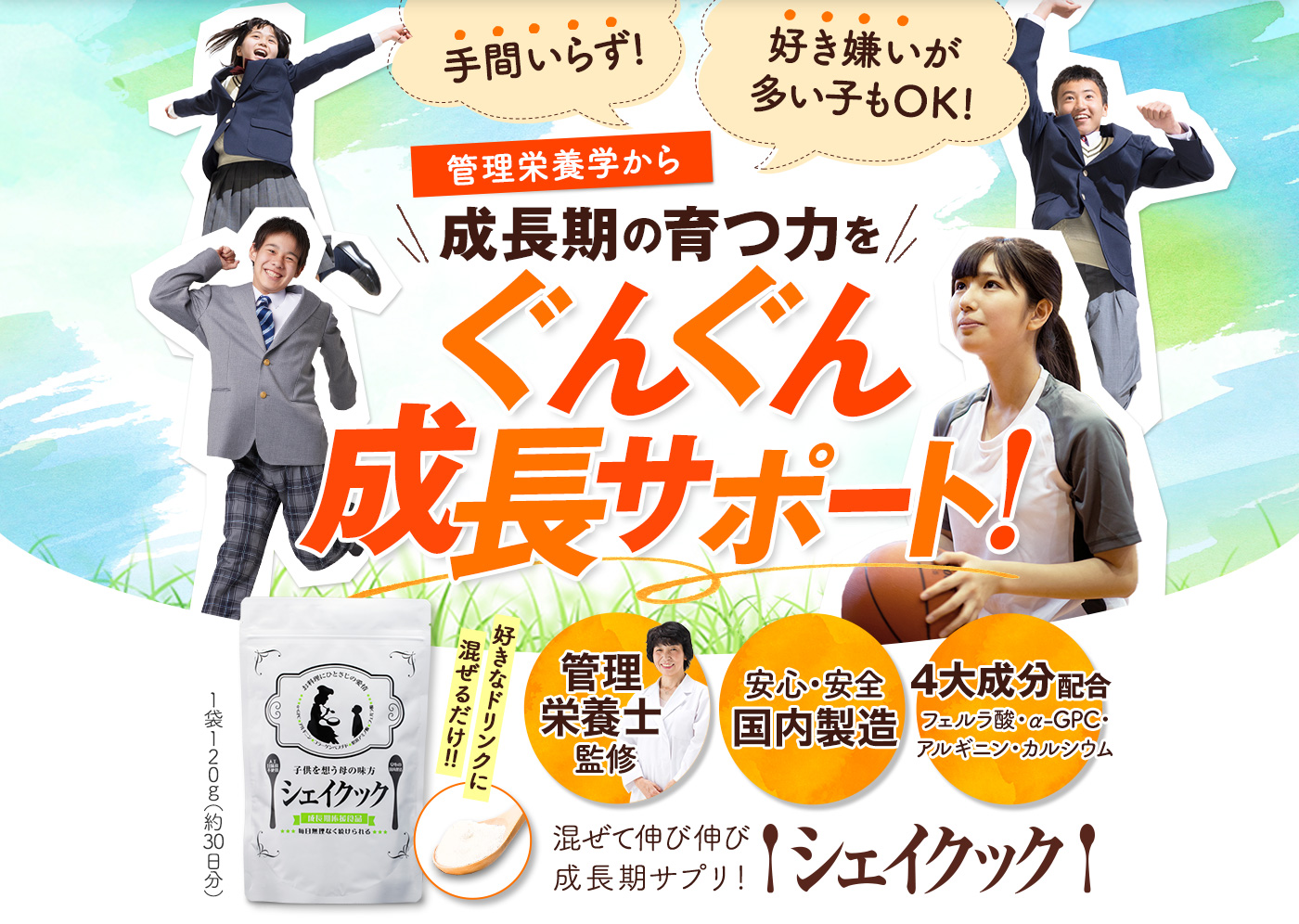 「シェイクック」は、成長期の子どもや体づくりを意識する方のために開発された、管理栄養士監修の栄養サポートサプリです。