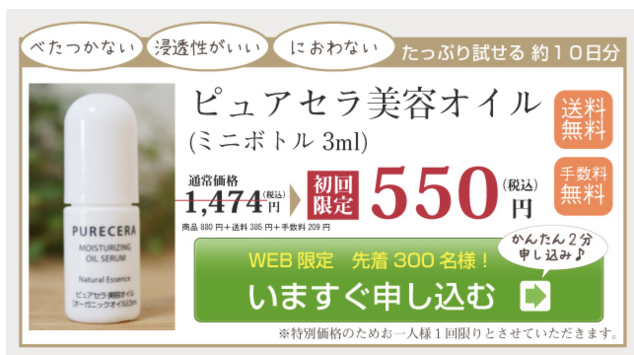 美容オイルは、肌の潤いを保ち、健やかで柔らかい肌を維持するために欠かせないアイテムです。ピュアセラは、セラミド配合で乾燥肌を根本からケアし、オーガニック成分で肌への負担を抑えた安心設計。初回500円で試せる手軽さもあり、効果を実感しやすい美容オイルです。
