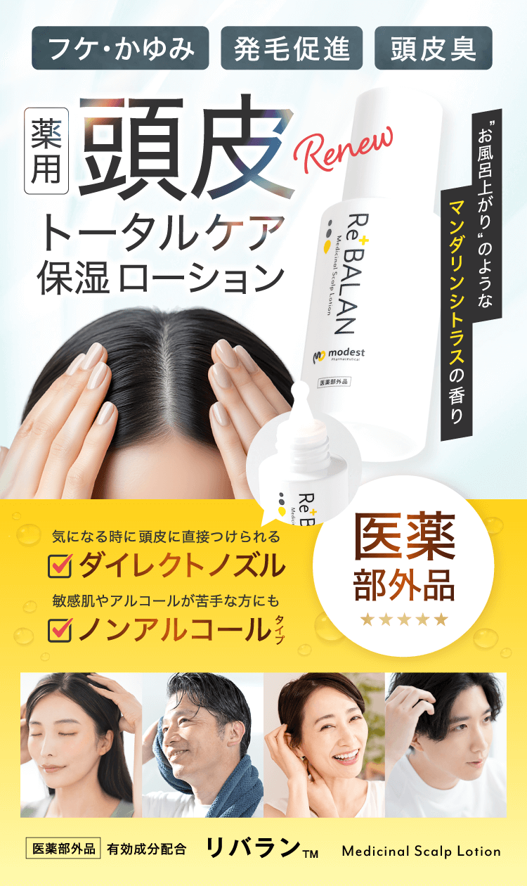 ReBALAN「フケかゆみ薄毛対策!頭皮ケアローション」は、フケ・かゆみ・べたつきなどの頭皮トラブルに対応しつつ、健康な髪を育む環境を整える薬用ローションです。低刺激処方で敏感な頭皮にも安心、定期購入で継続的なケアが可能。頭皮の乾燥や炎症を防ぎ、抜け毛や薄毛の予防にもつながるため、頭皮ケアをしっかり行いたい方におすすめの商品です。