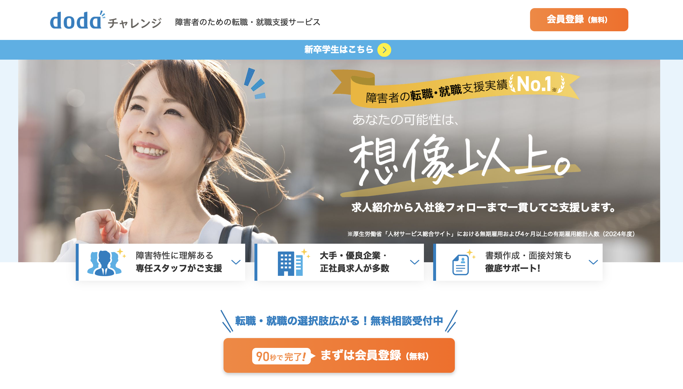 dodaチャレンジは、障害を持つ方の就職・転職支援に特化したサービスです。障害の有無にかかわらず、本人に合った働き方や職場環境を提案してくれます。専門のキャリアアドバイザーが一人ひとりの状況に合わせたサポートを行うため、安心して転職活動が進められる点が大きな特徴です。