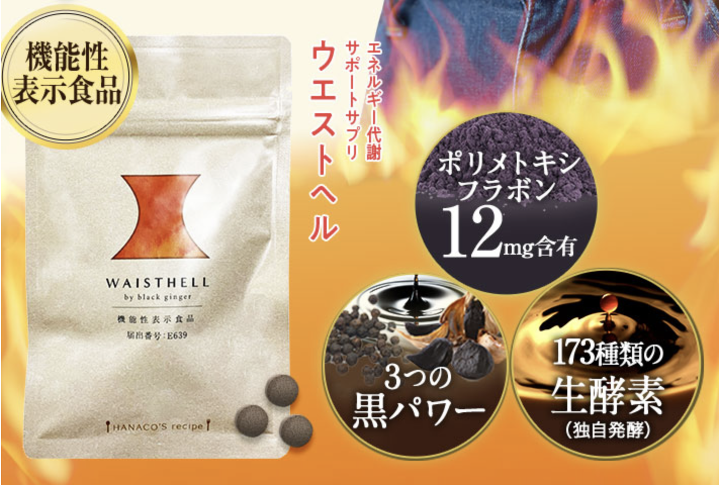 「WAISTHELL(ウエストヘル)」は、美人通販から登場した、ぽっこりお腹が気になる方のためのサプリです。お腹の脂肪を効率よく消費するブラックジンジャーを中心に、代謝をサポートする成分や生きた酵素を配合。毎日の習慣として取り入れるだけで、スッキリお腹を目指せます。
