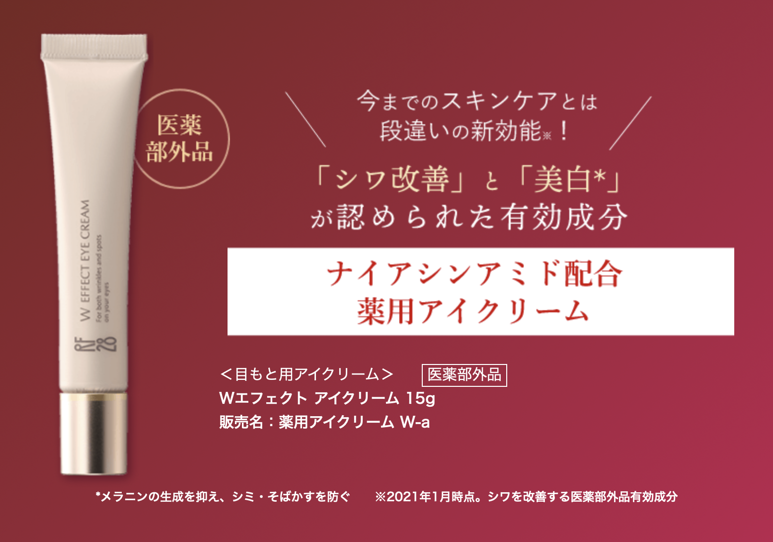 RF28 Wエフェクトアイクリームは、目元の「シワ改善」と「シミ予防(美白)」の両方を同時にケアできる医薬部外品のアイクリームです。乾燥や年齢サインがあらわれやすい目元に着目し、保湿と美白成分を組み合わせた処方で、日々のスキンケアに取り入れやすいアイテムとして人気があります。
