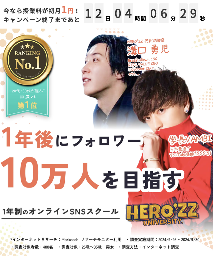 HERO’ZZ UNIVERSITYは、ただ「知識を詰め込む」講座ではなく、受講生一人ひとりに合わせたマンツーマン指導と、即実践できる課題中心のカリキュラムで「SNSで結果を出す」ことに特化したオンラインスクールです。本記事では、特徴・メリット・おすすめポイントを購入を検討している方向けにわかりやすく説明します。