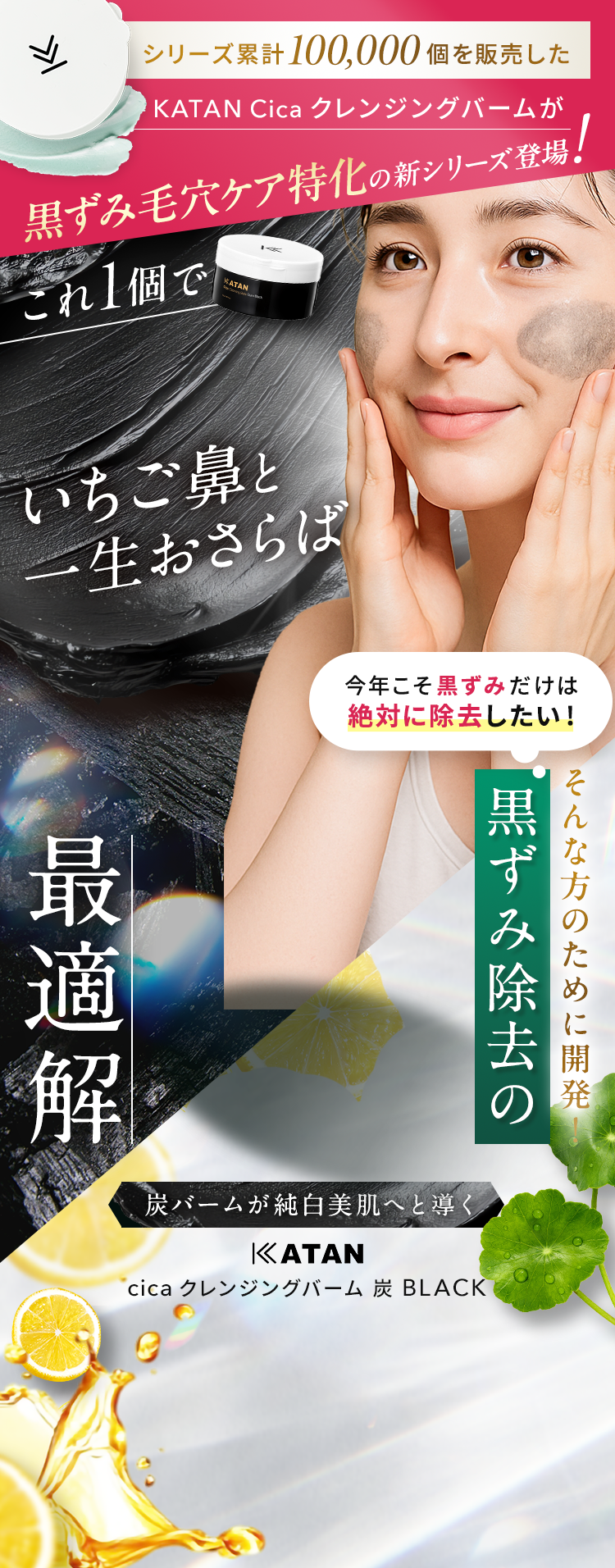 KATAN 毛穴特化クレンジングバーム 炭ブラックは、毛穴汚れ・黒ずみ・ざらつき・メイク落としを同時にケアしたい方のために開発されたクレンジングバームです。竹炭とクレイを組み合わせた独自処方により、黒いバームが皮脂やメイク汚れに馴染み、毛穴の奥までしっかりと洗い流せる設計です。