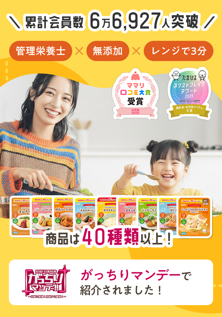 累計300万食突破の実績、安心安全な食材、手軽な利用方法、年齢に応じたメニュー、アレルギー対応など、子育て家庭に嬉しいポイントが盛りだくさん。